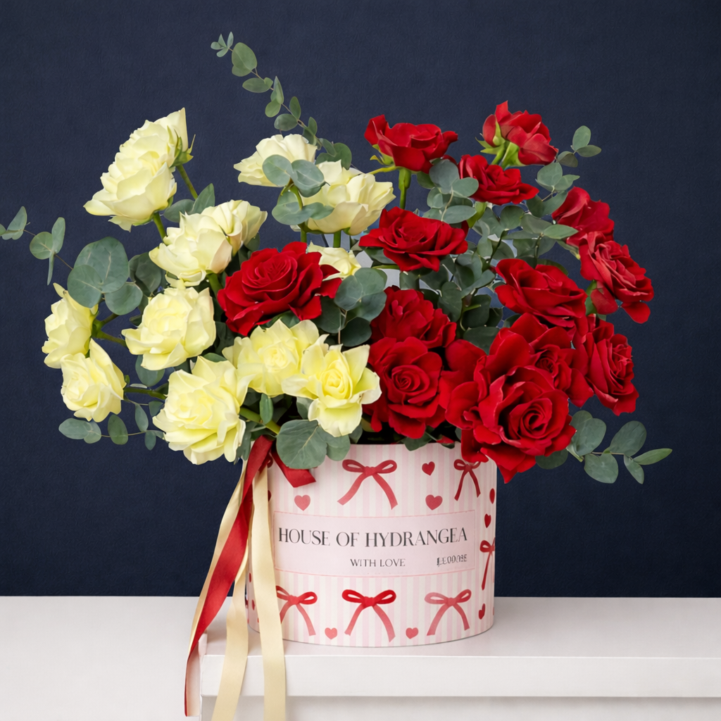 A romantic flower arrangement featuring red and cream roses with soft eucalyptus leaves.The deep red roses add passion, while the...
