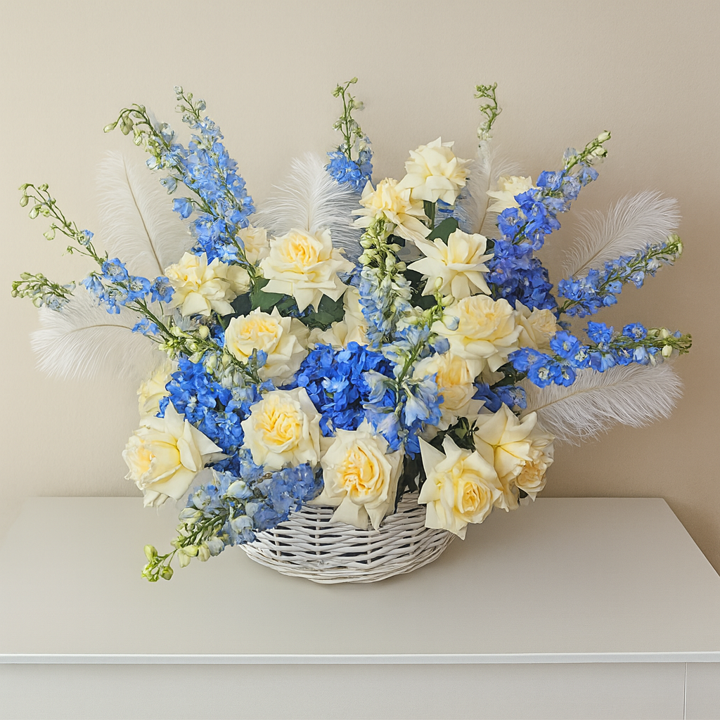 Celebrate the incredible person in your life with our best Blue basket Bring timeless beauty to any space  blue hydrangeas, elegantly displayed in a white basket. Perfect for home décor, office settings, or as a long-lasting gift, this luxurious piece adds a calming, natural look.