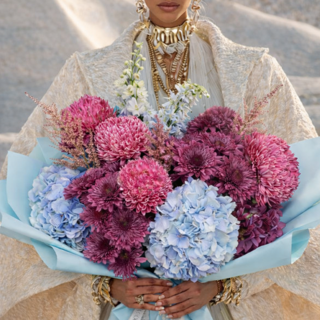 Handtied bouquet of fresh blooms including hydrangea, delphinium and chrysanthemum