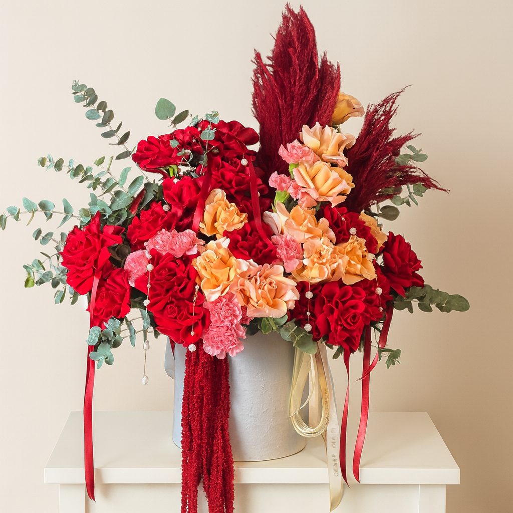 Luxury velvet red Roses Mixed with Peach Roses handpicked from exclusive rose farms, arranged perfectly in a bespoke handcrafted box that will elevate the luxury gifting experience. Same Day delivery in Dubai.
