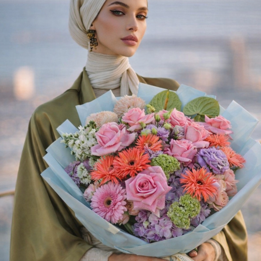 Handtied bouquet of fresh blooms including hydrangea, gerbera and roses
