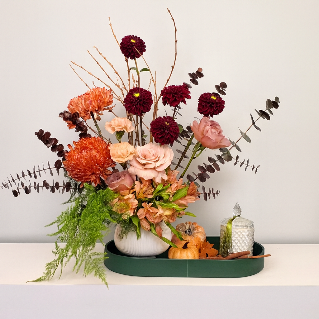 This elegant arrangement is perfect for any Autumn gift. Vase filed with the freshest seasonal roses, dahlia and carnation placed perfectly on a bespoke leather tray and a fragrant Pumpkin spiced candle