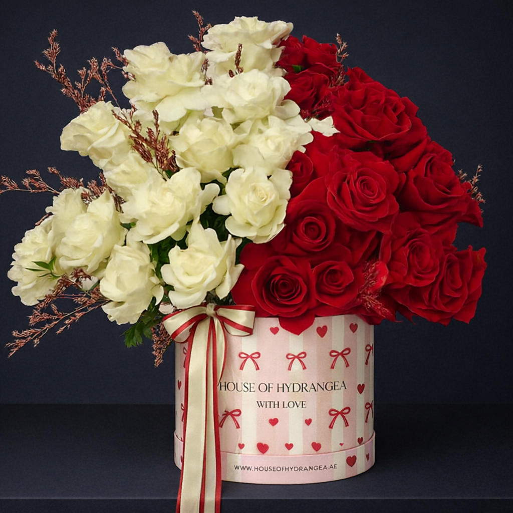 A romantic flower arrangement featuring red and cream roses with soft eucalyptus leaves.The deep red roses add passion, while the...