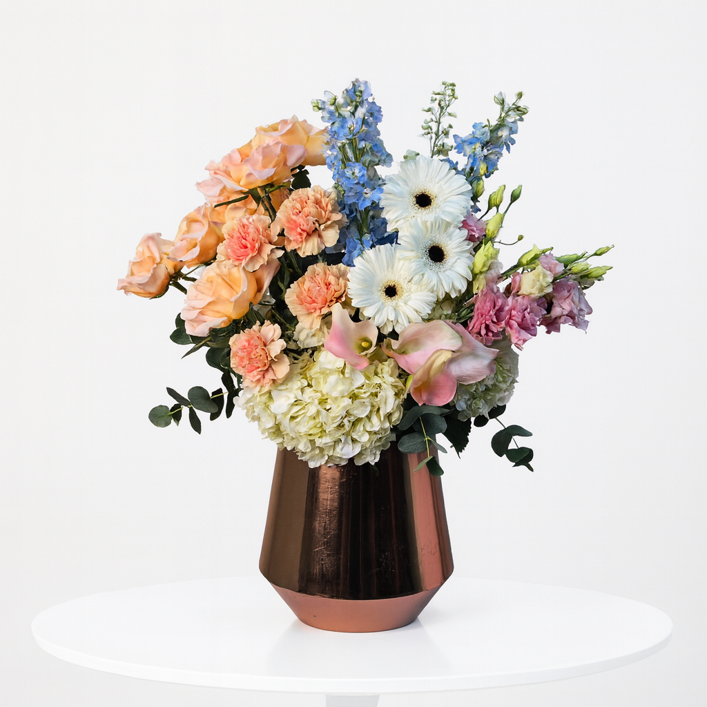 An exquisite peach rose, symbolizing deep love and gratitude. luxury white hydrangea and cheerful peach carnations with purity lively element combination of pink soft touch enhance the overall femineity and sweetness finished with tall delphinium.